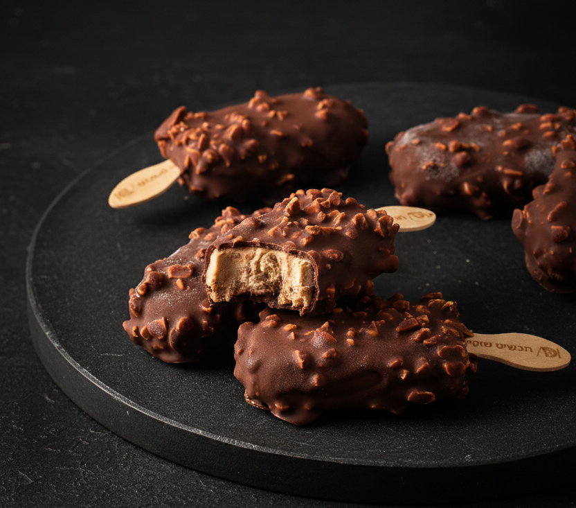 בעיטוף שוקולד מריר ושברי קראנץ' בוטנים.