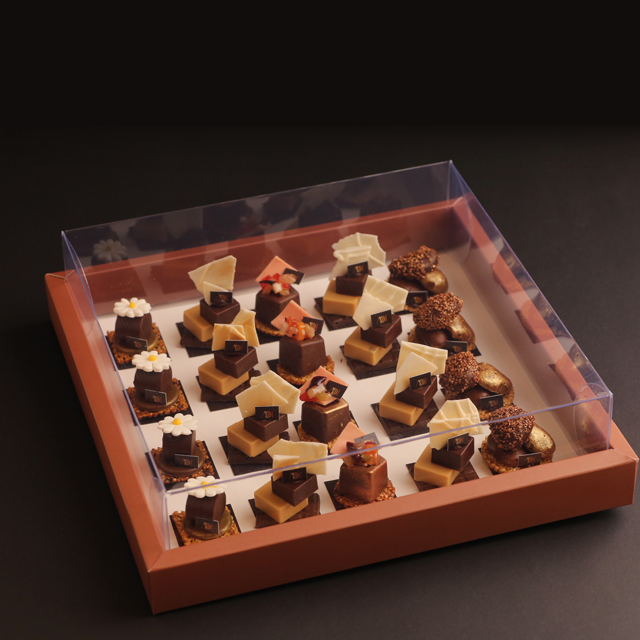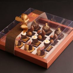 מארז מהודר המכיל 20 פטיפורים, מעוטר בסרטי סאטן תואמים וניתן בשקית בד ממותגת.