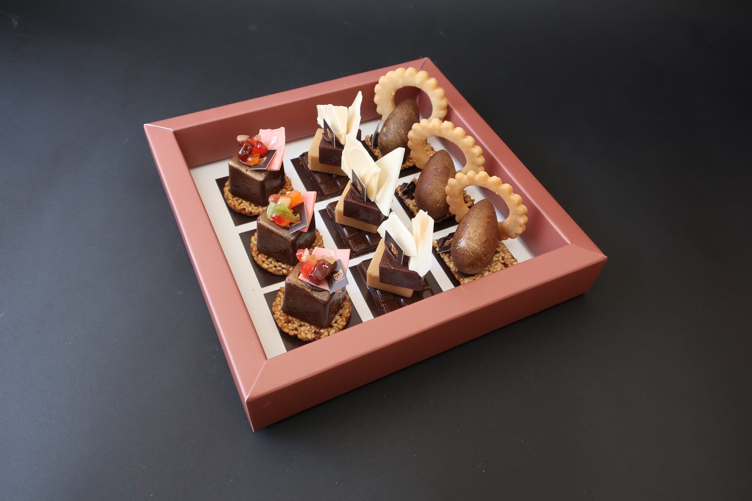 מארז מהודר המכיל 9 פטיפורים ומעוטר בסרט סאטן תואם.