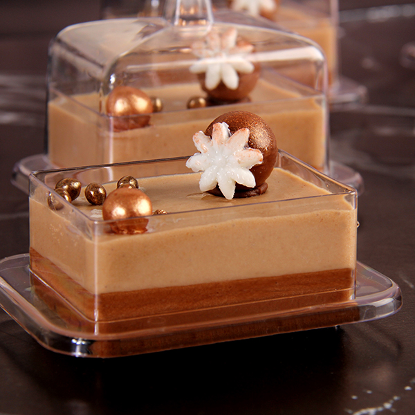 מוס קטיפתי בכוסות דקורטיביות תחתית פקאנים גרוסים מסוכרים ומוס שוקולד משובח ביותר קטיפתי ונימוח בעיטורי שוקולד אבסטרקטי בגוונים שונים וחרוזי שמבלה